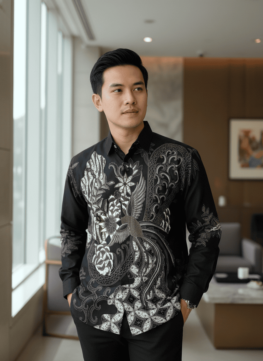 Motif batik dikerjakan dengan detail yang presisi, menghadirkan kesan maskulin, elegan, dan eksklusif. Cocok digunakan untuk acara resmi, kerja, kondangan, hingga tampilan harian yang tetap berwibawa.